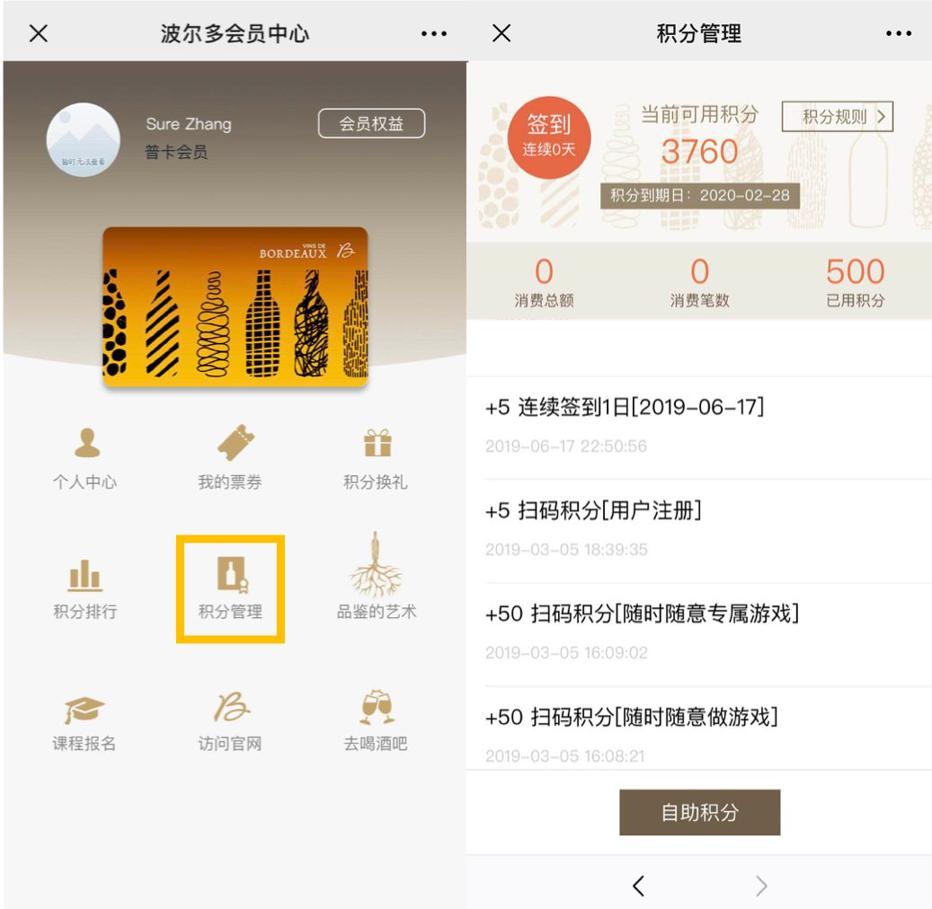 如果你是会员卡的老朋友,点击进入【积分管理】即可查看并管理自己通过在波尔多酒吧消费得到的积分。不要觉得积分不够用哦,后续您可以通过每日签到,或者波尔多葡萄酒消费签到并上传消费小票获得相应积分。同样地,完成波尔多葡萄酒学校的学习,也会有积分赠送哦!
