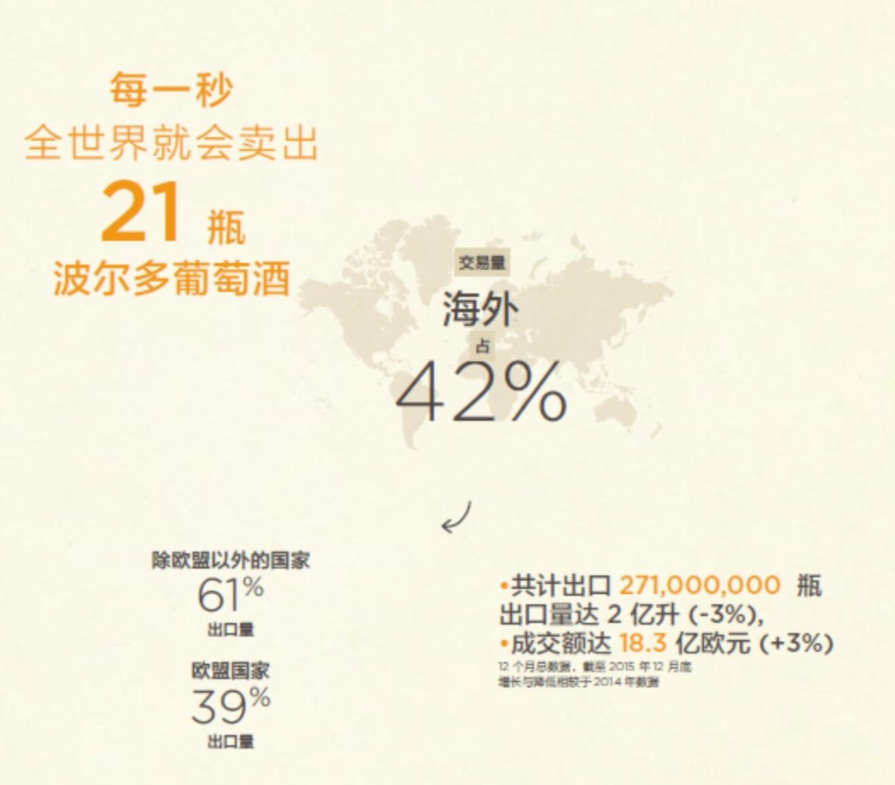 海外市场对波尔多葡萄酒的意义愈发重大,占据了波尔多交易量的42%。2015 年波尔多葡萄酒的总出口量达2.035亿升,出口额为18.26亿欧元。每一秒,全世界就会卖出21瓶波尔多。